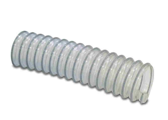 Polyurethan-Schlauch für das Ansaugen von leicht abrasiven Produkten, antistatisch. PVC-Spirale und mit eingedrehter Erdung aus Kupfer, innen glatt und außen gewellt. Leichtigkeit und Flexibilität.